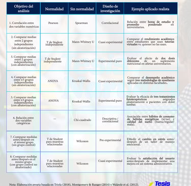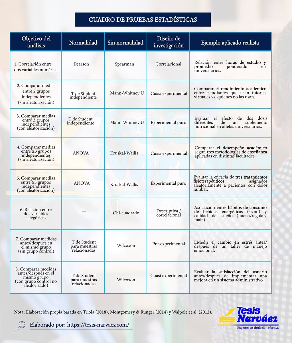 Este recurso visual presenta un cuadro comparativo diseñado para orientar a investigadores y estudiantes en la elección de la prueba estadística más adecuada según los objetivos de su estudio. La tabla estructura la toma de decisiones basándose en un criterio fundamental: la distribución de los datos. De esta manera, distingue claramente entre las pruebas paramétricas, aplicables cuando existe normalidad (como la correlación de Pearson, la prueba T de Student y ANOVA), y sus contrapartes no paramétricas, necesarias cuando no se cumple este supuesto (como Spearman, U de Mann-Whitney, Kruskal-Wallis y Wilcoxon). El cuadro abarca un amplio espectro de análisis, desde la correlación de variables y el estudio de datos categóricos mediante Chi-cuadrado, hasta la comparación de medias en dos o más grupos, ya sean independientes o muestras relacionadas (antes y después). Para facilitar su aplicación práctica y asegurar el rigor metodológico, cada prueba se contextualiza dentro de su diseño de investigación correspondiente —como experimental, cuasi-experimental o correlacional— e incluye ejemplos realistas que ilustran su uso en situaciones concretas.