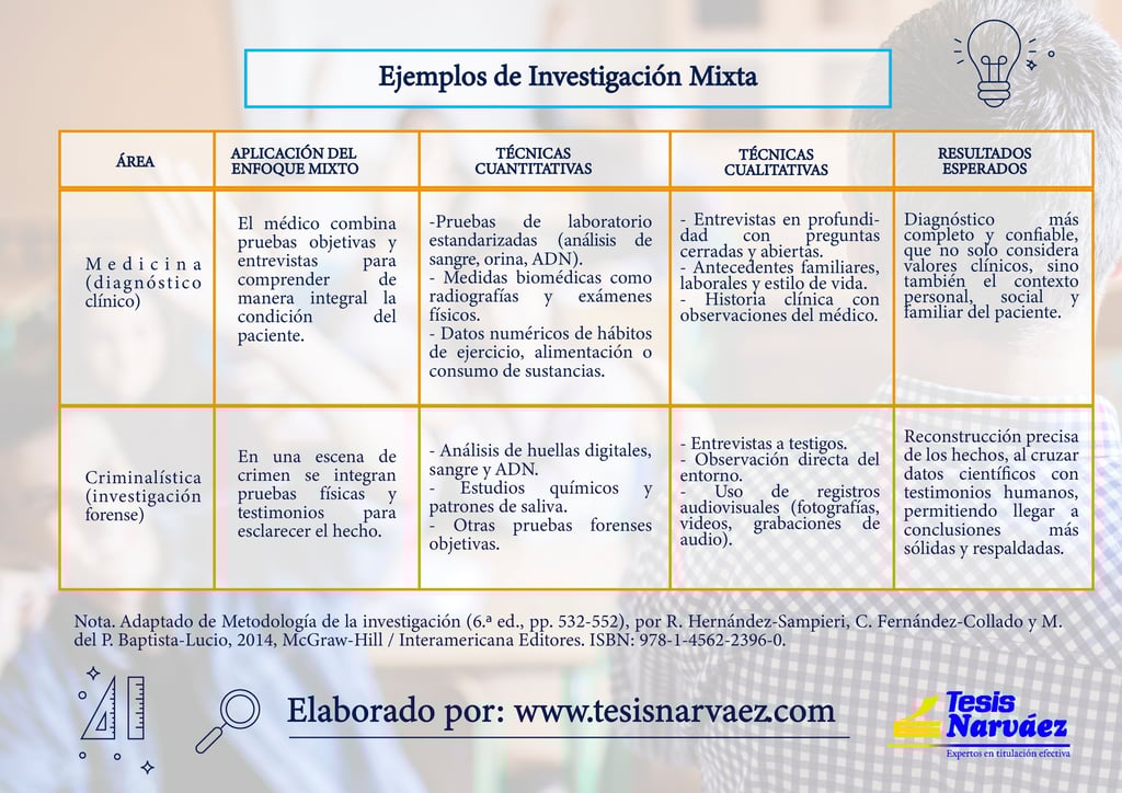 La investigación mixta combina métodos cuantitativos y cualitativos para obtener una comprensión integral de los fenómenos estudiados. Este enfoque permite integrar datos numéricos con percepciones y experiencias humanas, logrando resultados más completos y confiables. En la imagen se muestran ejemplos prácticos aplicados en Medicina y Criminalística, donde la combinación de pruebas objetivas, entrevistas y observaciones genera diagnósticos y conclusiones más precisas.