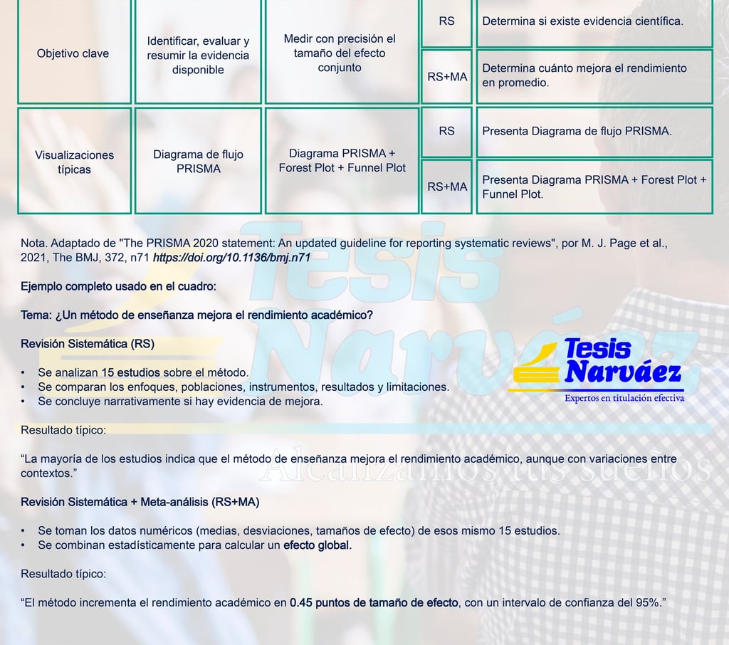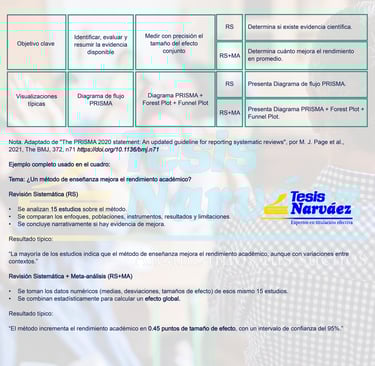 El documento explica de forma comparativa la diferencia entre una Revisión Sistemática (RS) y una Revisión Sistemática con Meta-análisis (RS+MA). La Revisión Sistemática es un estudio científico que recopila, evalúa y sintetiza toda la evidencia disponible sobre un tema de manera rigurosa y reproducible. Su resultado principal es una síntesis narrativa, donde se describen metodologías, contextos, resultados y limitaciones de los estudios revisados. El Meta-análisis es una fase estadística opcional dentro de la revisión sistemática, destinada a combinar cuantitativamente los resultados de varios estudios para obtener un tamaño de efecto global. Esta técnica requiere comparabilidad entre estudios y utiliza modelos estadísticos como efectos fijos o aleatorios. Mientras que la RS responde si existe evidencia científica, el RS+MA permite determinar cuánto efecto tiene el método analizado en promedio, utilizando medidas como medias, desviaciones e intervalos de confianza. Ambos enfoques emplean herramientas visuales: la RS utiliza el diagrama PRISMA, mientras que el RS+MA incorpora además gráficos como Forest Plot y Funnel Plot. El ejemplo aplicado muestra que, cuando se analizan 15 estudios sobre un método de enseñanza, la RS concluye narrativamente que mejora el aprendizaje, mientras que el meta-análisis cuantifica el efecto en 0.45 puntos, considerado un efecto medio.
