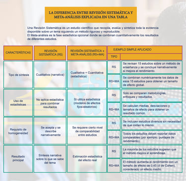 LA DIFERENCIA ENTRE REVISIÓN SISTEMÁTICA Y META-ANÁLISIS EXPLICADA EN UNA TABLA
